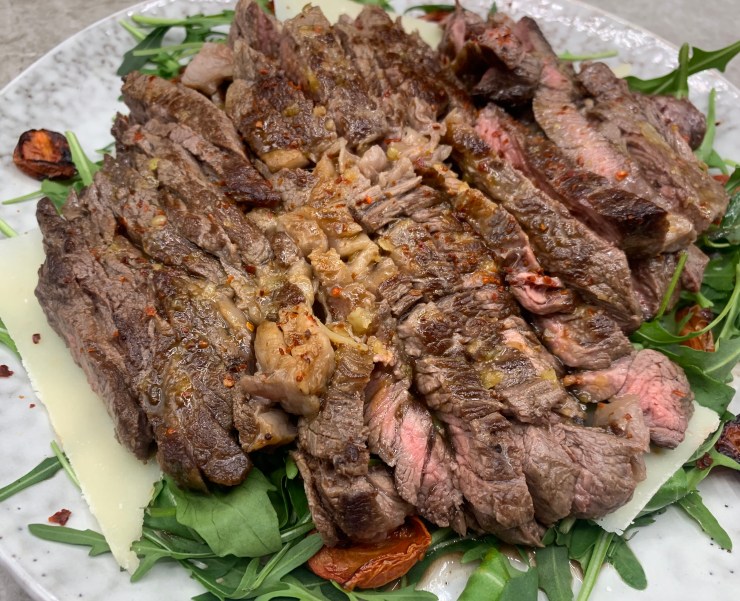 - Place your rocket leaves and parmesan on a large round plate. Add the tomatoes and the steak. Drizzle with some of the red wine vinegar mixture.