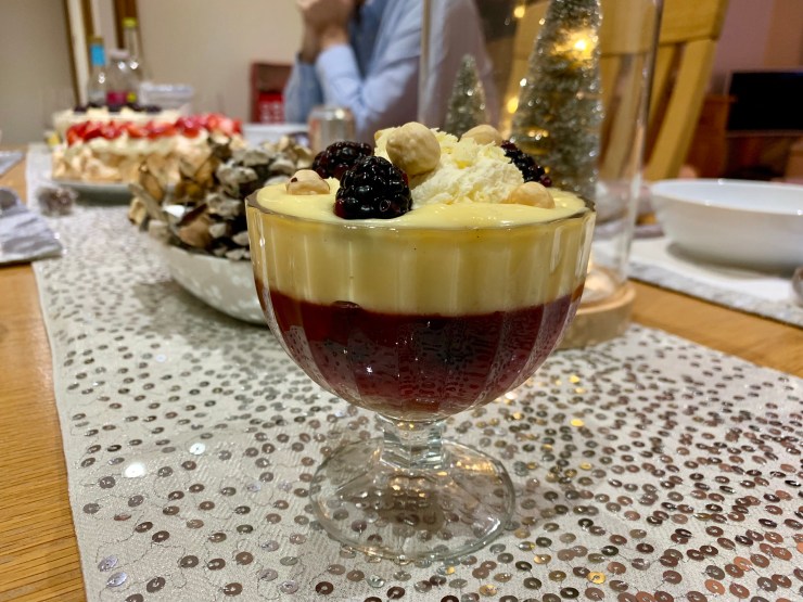 This is an elegant looking desert with deep purple jelly under a white chocolate spiked custard. The flavour of the blackberries are balanced with the taste of white chocolate in the custard and the nip of brandy in the trifle sponges. This does take time to make but you get the taste more to your liking than having that artificial tasting fruit cocktail from school dinners.