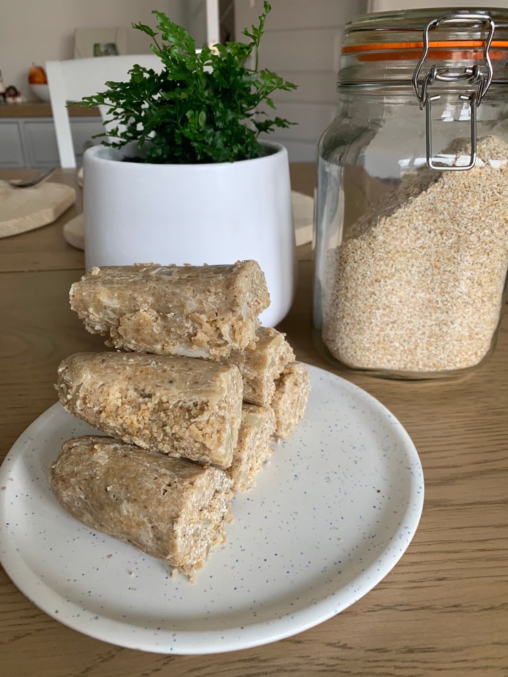 5. Prepare a strip of cling film and spread the mealy pudding in a long line to your desired thickness. Cover with cling film and roll into a log. Place into the fridge to harden.