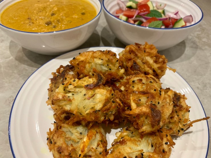 11. Fry the potato koftas in batches of 4-5 for around 3 minutes each side until well browned. Remove and place on wire rack in the oven to keep warm.