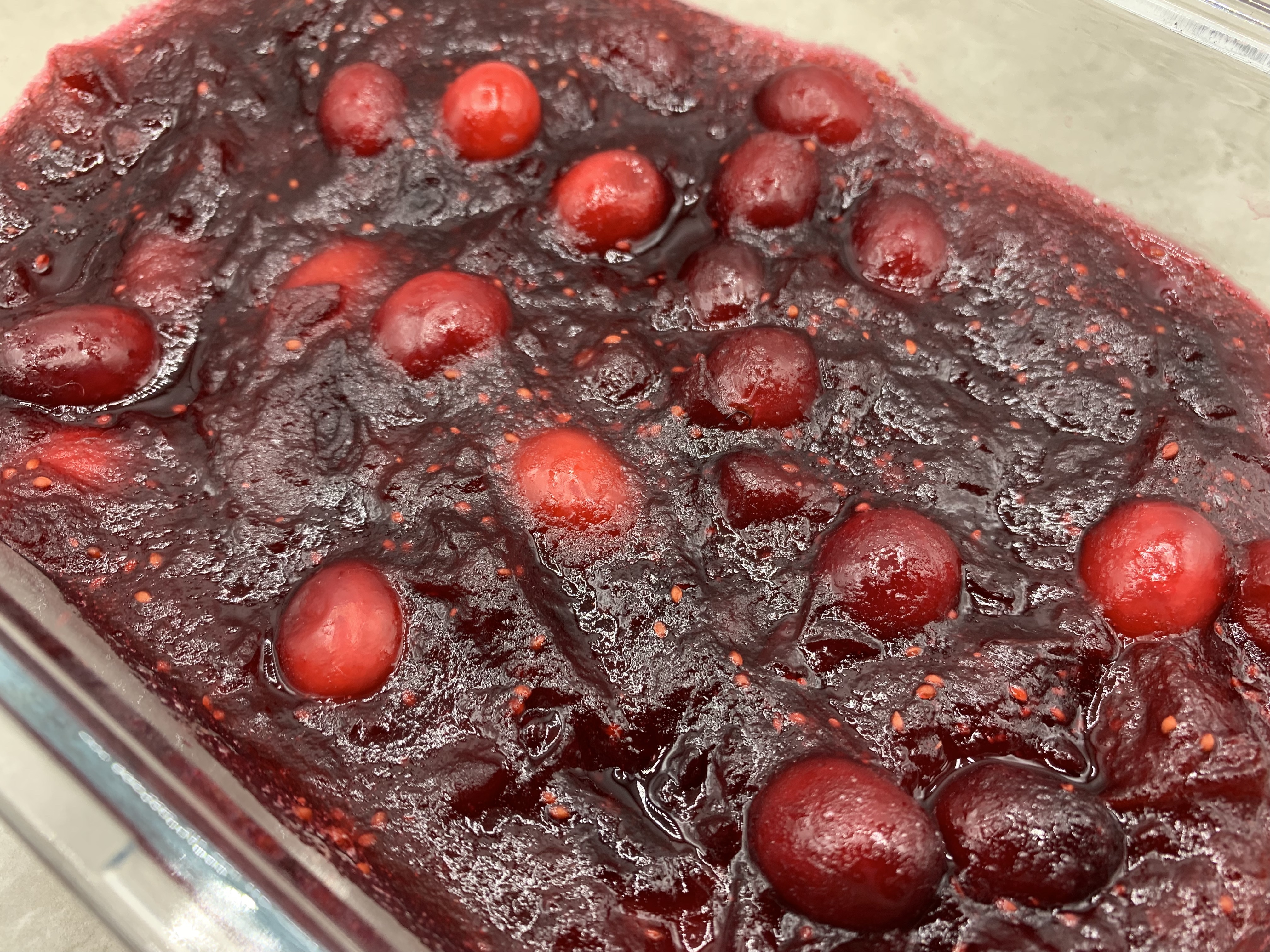 2. In a pan add all but a handful of the cranberries and a little of the syrup. Heat on a low to medium heat stirring occasionally until the cranberries have softened.