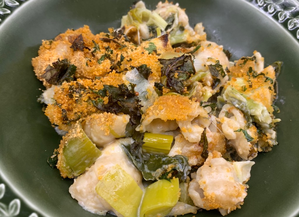 So let’s make so comfort food but healthier. My Macroni & Greens it is. Wholemeal pasta, lots of greens, light cheese sauce and crisp kale and garlic crumb. Is it healthy, well kinda.