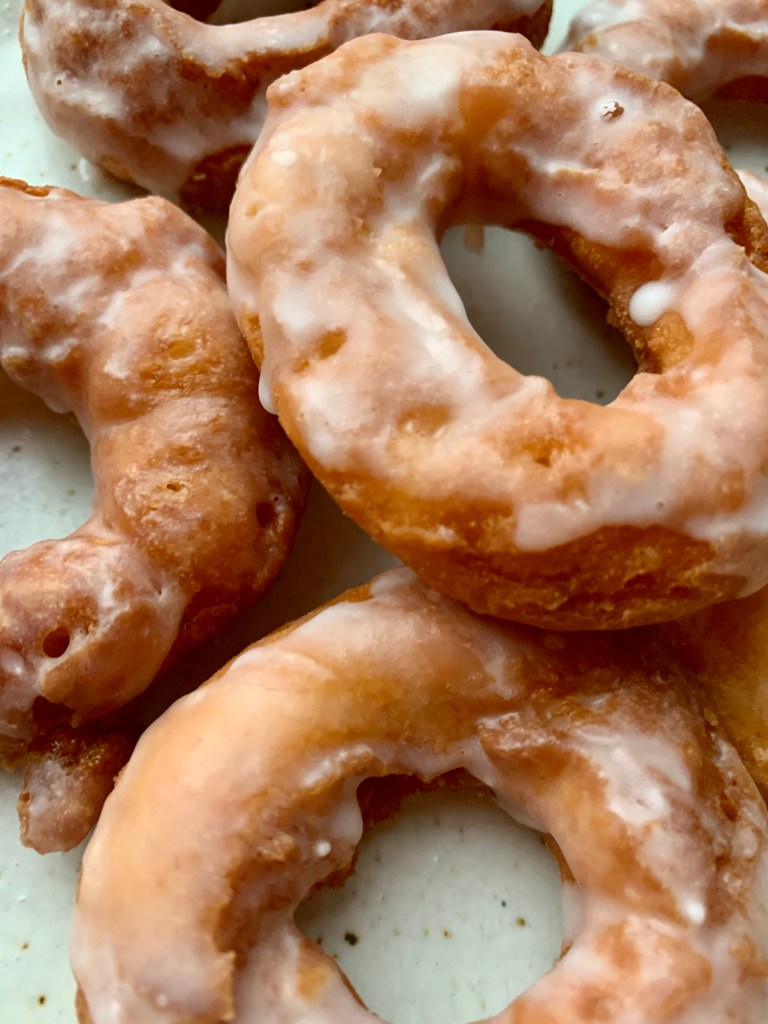 Old fashioned doughnuts are different from regular doughnuts in that they are more cake like and don’t rely on yeast for rising. Fittingly, with these being “old fashioned” doughnuts, I’ve created a condensed milk icing.