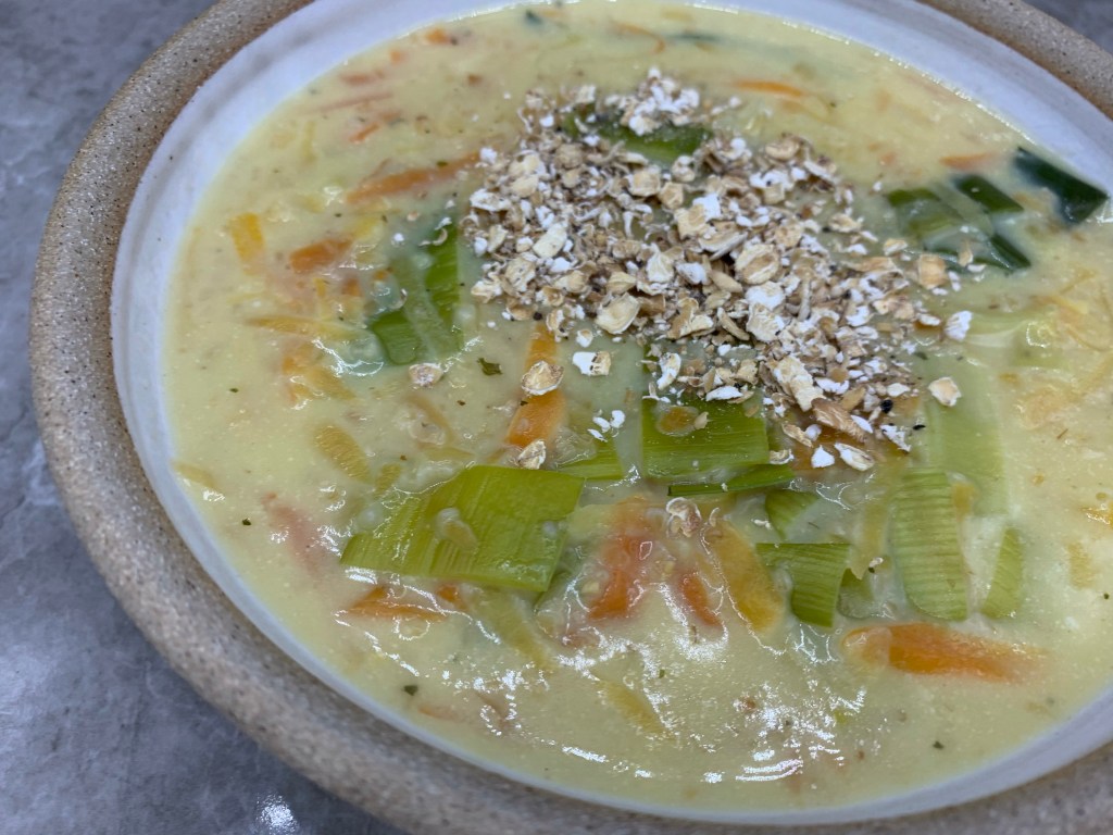 - Add the vegetables and oatmeal to a large stock pot with the butter. Sweat for 5-10 minutes ensuring the leeks do not burn and only slightly caramelise.