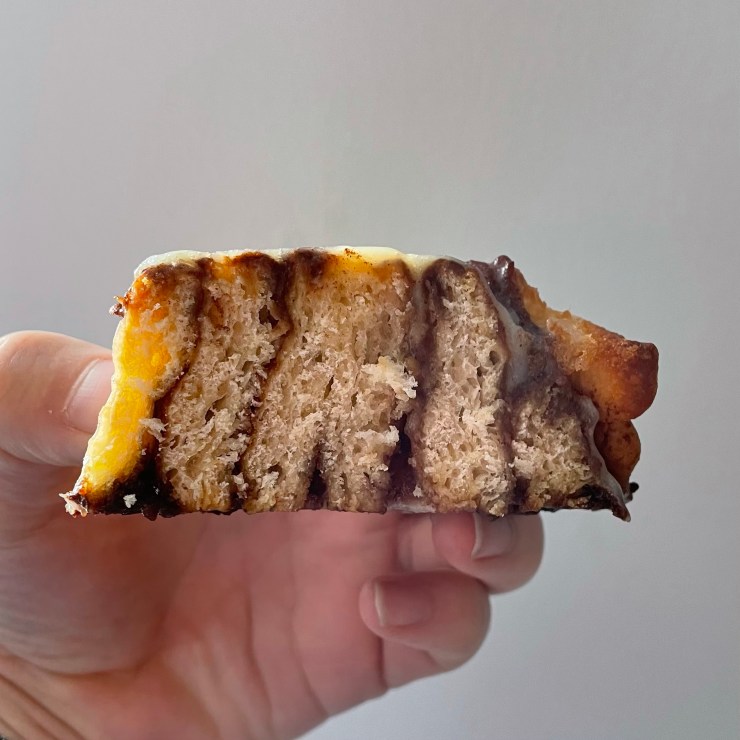These are lazy cinnamon rolls relying on slow fermenation in the fridge over 36-48 hours ultimately giving a texture in between that of a soft cinnamon roll and a bready one. The technique looks unusual but in some ways is similar to a sourdough recipe with the only difference is that you are using standard fast action yeast instead. Definitely worth a try, avoiding kneading and also having a dough that is a lot easier to roll.